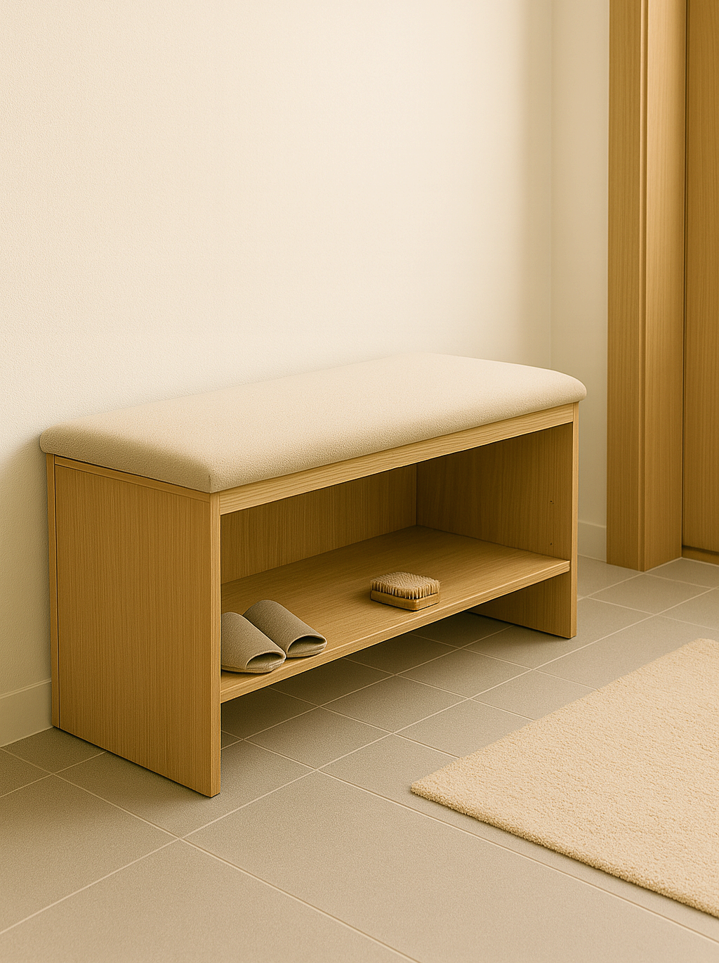 현관에 벤치형 수납장을 두면 신발을 신을 때 앉을 수 있고, 안쪽에는 신발 클리너, 우산, 여분의 슬리퍼를 넣을 수 있습니다. 앉는 공간과 수납이 동시에 해결되는 가성비 좋은 아이템입니다.