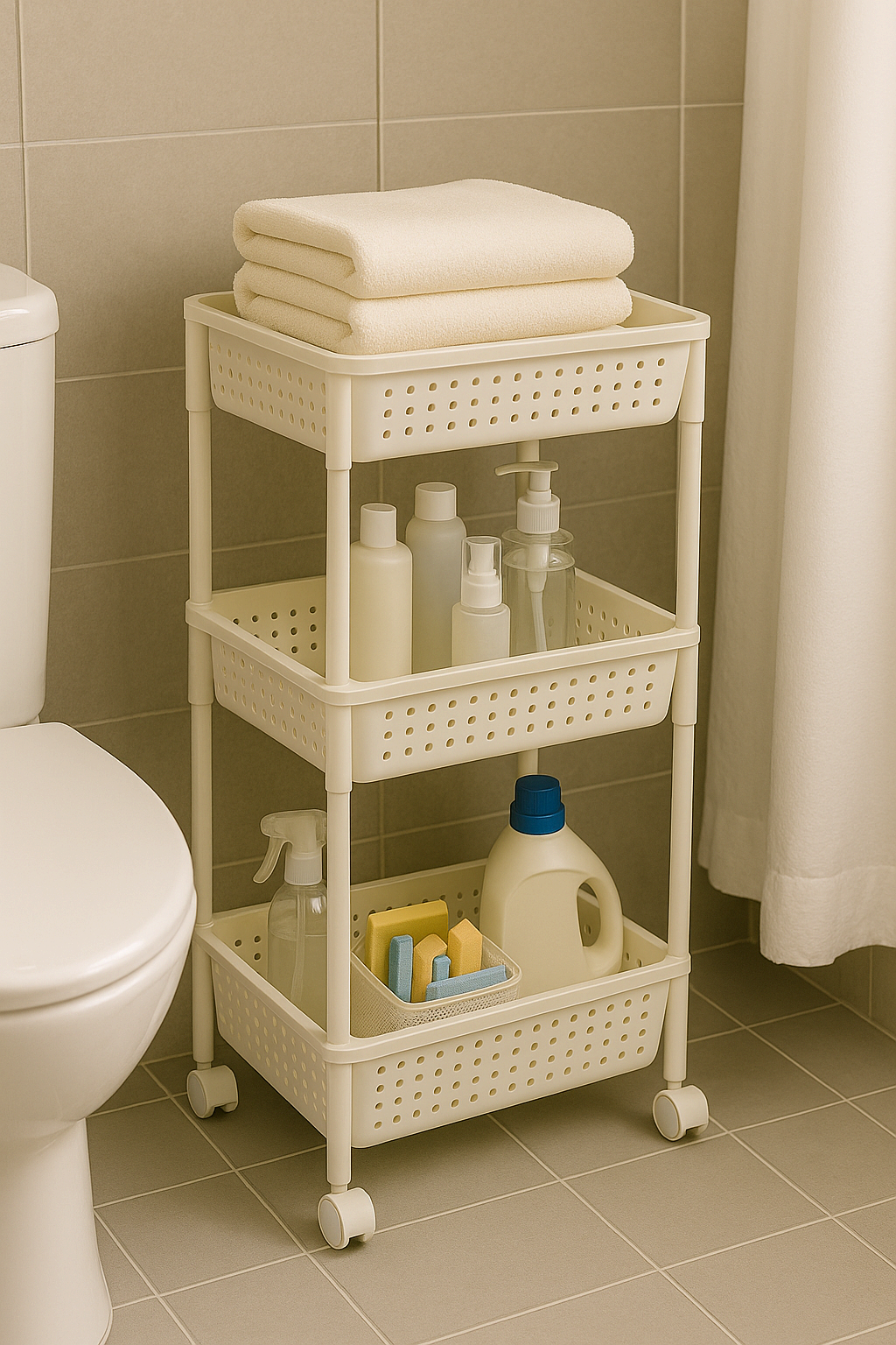 욕실이 좁아 수납장이 부족하다면 이동식 수납 카트를 활용해 보세요. 세면도구, 수건, 청소용품을 담아 이동할 수 있어 편리합니다.
