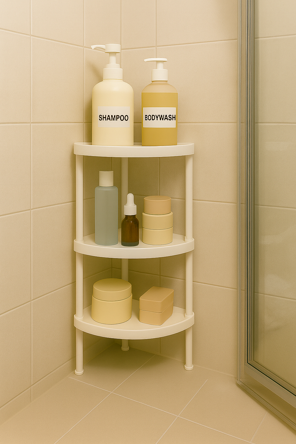 욕실 모서리를 활용할 수 있는 코너 선반은 샴푸, 바디워시, 스킨케어 용품을 깔끔하게 정리해 줍니다. 공간 활용도가 높고, 물 빠짐이 잘되는 제품을 고르면 위생적입니다.