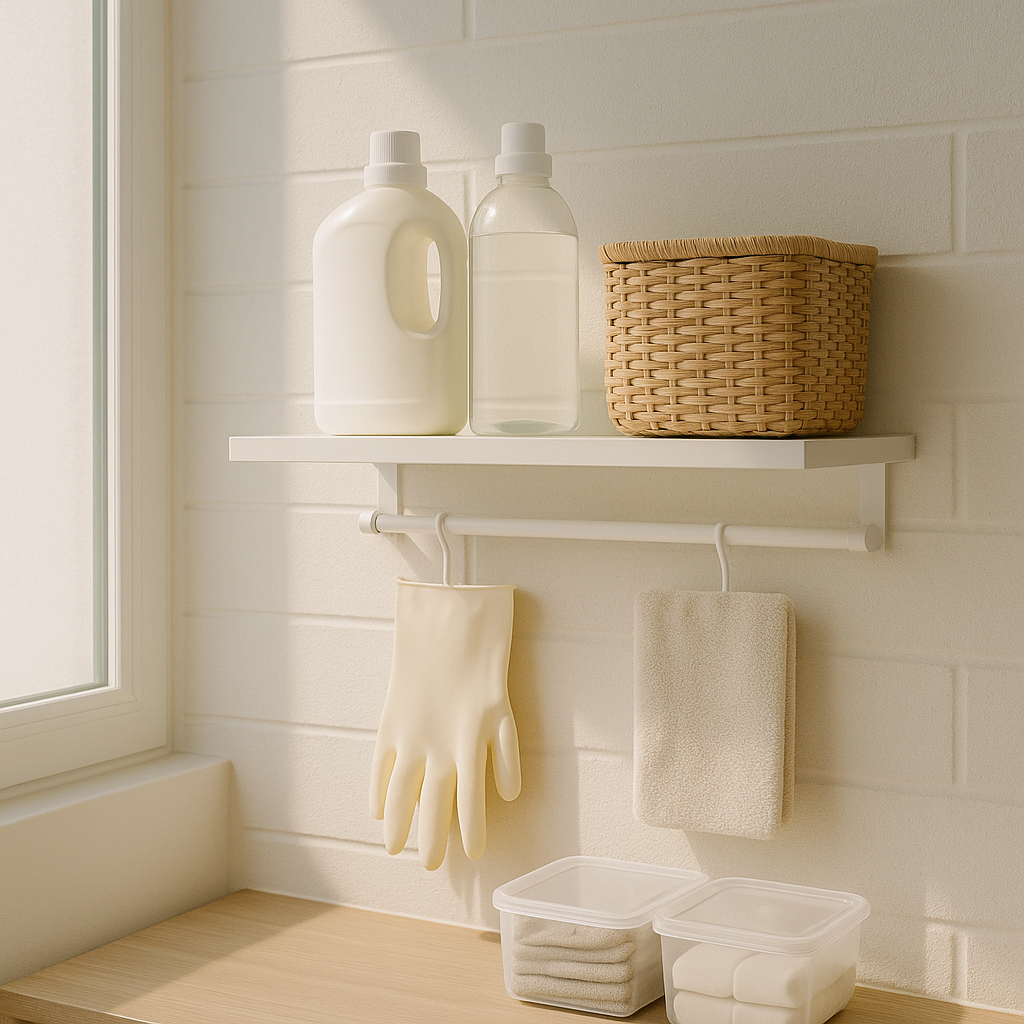 건조대만 두기에는 아까운 벽면은 선반과 행거로 활용하세요. 세제, 섬유유연제, 청소도구는 벽 선반에 올려 보관하고, 청소용 장갑이나 걸레는 행거에 걸어두면 바닥이 지저분해지지 않습니다. 작은 바스켓을 선반에 올려 카테고리별로 정리하면 더욱 깔끔합니다.