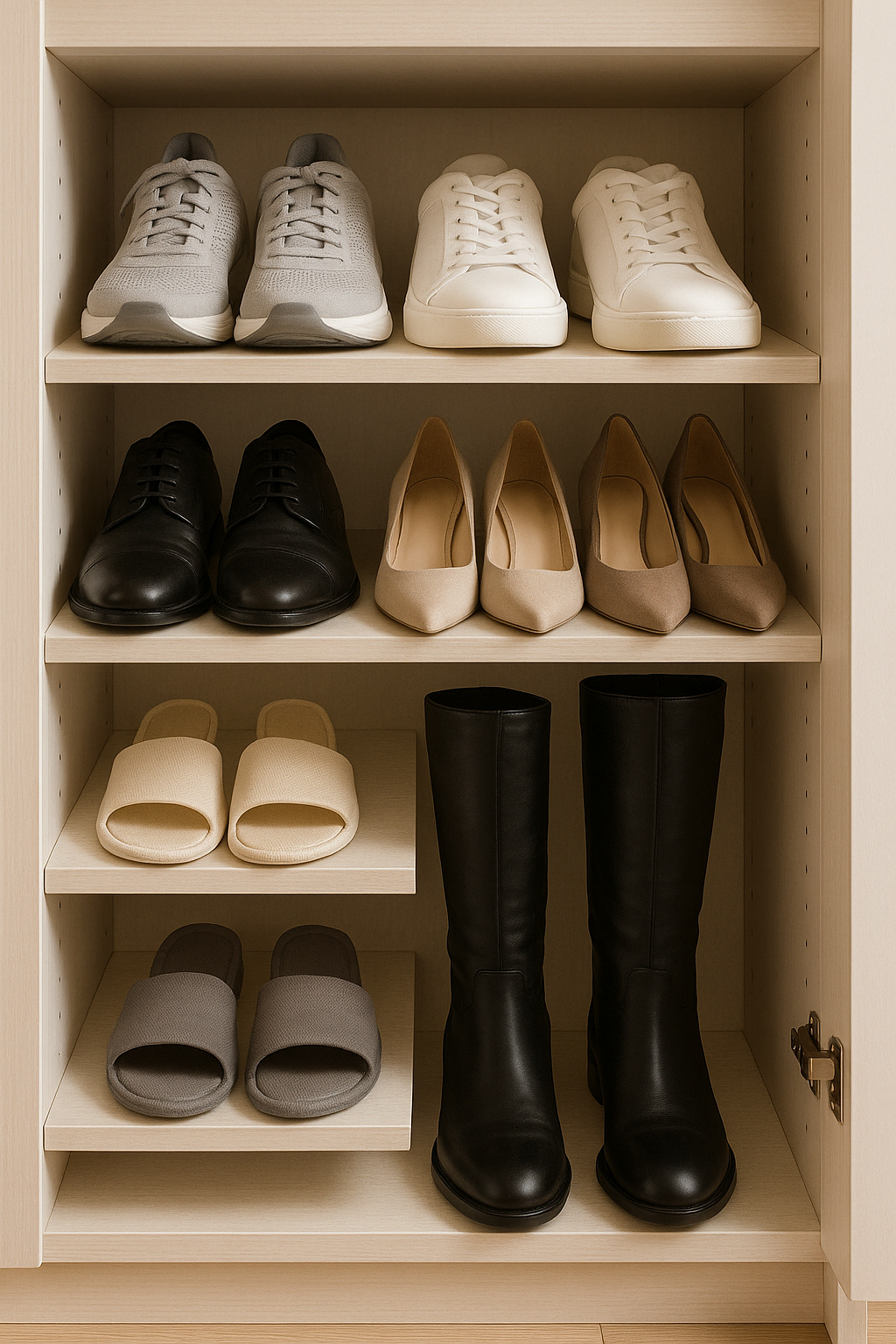 신발장 선반은 대부분 높이 조절이 가능합니다. 힐이나 부츠처럼 높이가 큰 신발은 공간을 넓히고, 플랫슈즈·운동화는 선반 간격을 좁혀 보관하세요. 조절만 잘해도 수납력이 20~30% 늘어납니다.