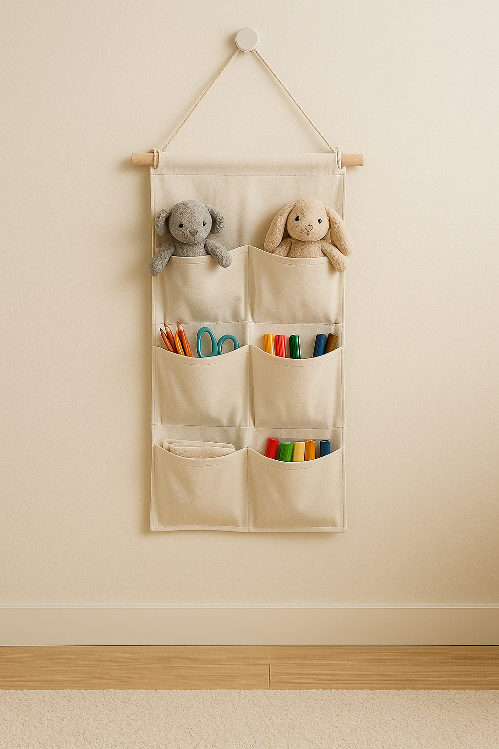 바닥은 놀이 공간으로 최대한 비워두는 것이 좋습니다. 벽면에 설치하는 수납 포켓이나 매쉬망을 활용하면 장난감을 세로 공간에 정리할 수 있어 거실이나 아이 방이 훨씬 넓어 보입니다. 특히 작은 인형이나 액세서리, 미술 도구 같은 가벼운 장난감은 벽걸이 수납이 제격입니다.