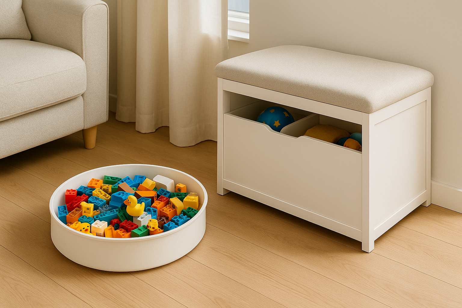수납형 벤치나 수납 테이블은 작은 집에서도 공간을 효율적으로 활용할 수 있는 좋은 방법입니다. 장난감을 수납하는 동시에 앉거나 놀 수 있는 공간으로 활용할 수 있어 실용적입니다. 특히 뚜껑이 있는 벤치는 대형 장난감이나 계절별 장난감을 보관하기에 좋습니다.