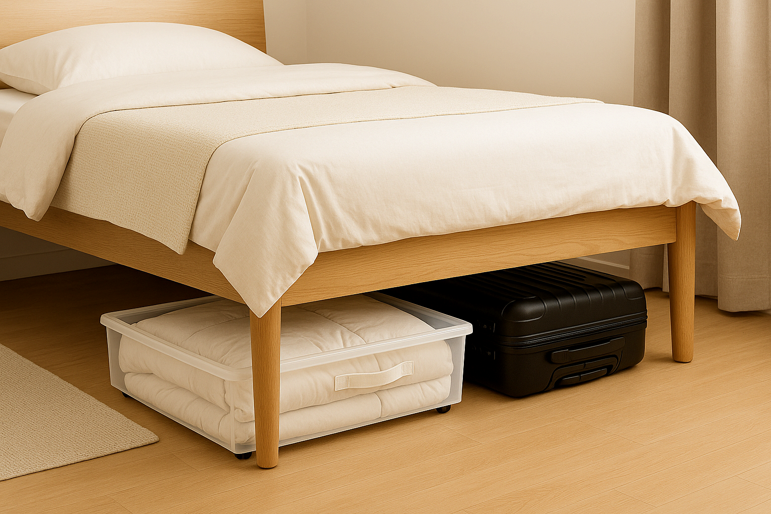 원룸에서 가장 큰 가구는 침대입니다. 침대 밑 공간을 그냥 비워 두면 큰 면적이 낭비됩니다. 바퀴 달린 수납 박스나 접이식 수납함을 두면 계절 이불, 캐리어, 잘 안 쓰는 물건을 깔끔하게 보관할 수 있습니다. 침대 밑은 눈에 잘 보이지 않아 공간은 넓게 쓰면서 수납 용량은 크게 늘릴 수 있는 최적의 자리입니다.