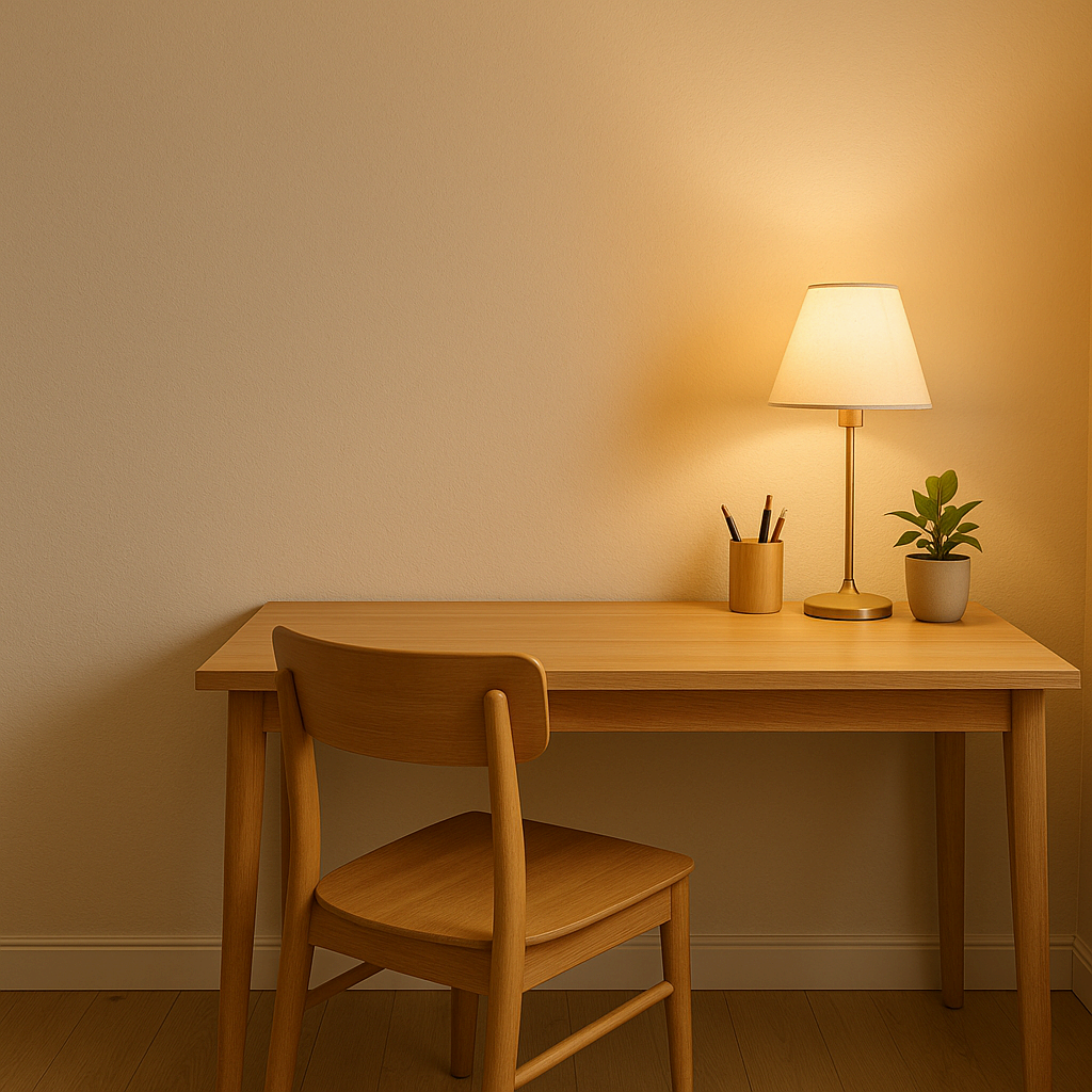 벽을 등지고 안정적으로 배치된 책상과 따뜻한 조명이 있는 홈오피스