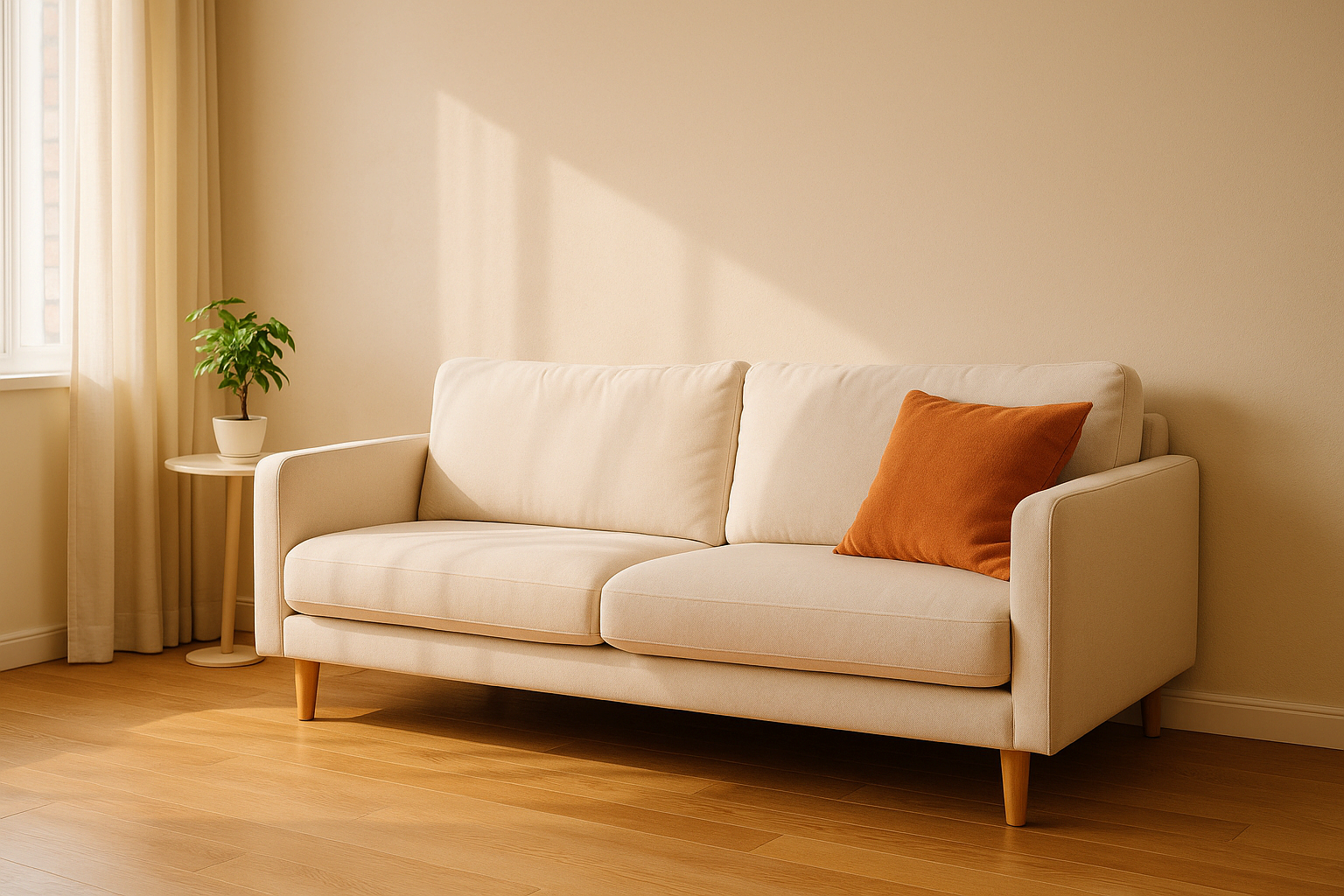 베이지톤 벽과 따뜻한 오렌지빛 쿠션이 조화를 이루는 거실 인테리어