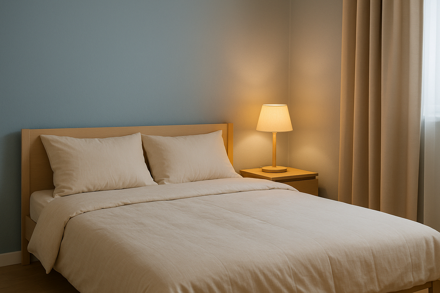 블루톤 벽과 크림색 침구가 조화를 이루는 차분한 침실